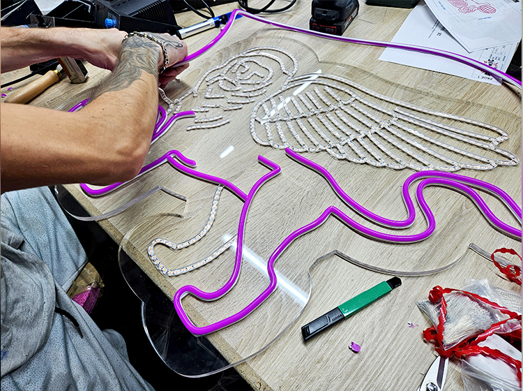 Nos maîtres néonistes façonnent des tubes en verre pour créer des enseignes lumineuses sur mesure, offrant un éclairage distinctif et authentique.